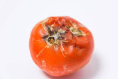 Zepsuty pomidor na czarnym tle. Pomidor z pleśni. Choroba pomidora. Niewłaściwe przechowywanie warzyw.
