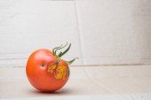 Zepsuty pomidor na czarnym tle. Pomidor z pleśni. Choroba pomidora. Niewłaściwe przechowywanie warzyw.