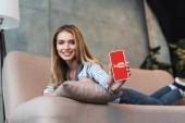 wesoły młoda kobieta gospodarstwa cyfrowego tabletu z aplikacji youtube na ekranie na różowym tle