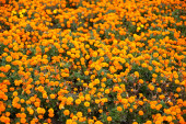 Bliska California Golden Poppy i Goldfields kwitnący w Walker Canyon Lake Elsinore, Ca. Stany Zjednoczone Ameryki. Jasny pomarańczowy kwiaty maku w California desert super bloom sezon wiosna.