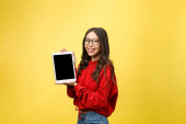Szczęśliwa młoda kobieta trzymając tablet cyfrowy z pustego ekranu na różowym tle