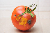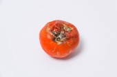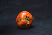 Zepsuty pomidor na czarnym tle. Pomidor z pleśni. Choroba pomidora. Niewłaściwe przechowywanie warzyw.