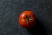 Zepsuty pomidor na czarnym tle. Pomidor z pleśni. Choroba pomidora. Niewłaściwe przechowywanie warzyw.