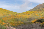Zdjęcie "Wzgórza z California Golden Poppy i Goldfields kwitnący w Walker Canyon Lake Elsinore, Ca. Stany Zjednoczone Ameryki. Jasny pomarańczowy kwiaty maku w California desert super bloom sezon wiosna." może być wykorzystywane do celów osobistych i komercyjnych zgodnie z warunkami zakupionej licencji Royalty-free. Obraz jest dostępny do pobrania w jakości wysokiej rozdzielczości do 5760x3840.