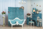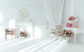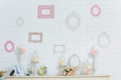 Wnętrze wiosny. Tekstura białej ściany z cegły. Ramki wiszące na ścianie. Białe pianino. Bukiety w wazach na kolumnach. Świeczniki są na fortepianie. Wystrój pokoju kwiatów. Strefa zdjęć.