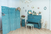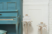 Zdjęcie "Wnętrze wiosny. Tekstura białej ściany z cegły. Ramki wiszące na ścianie. Białe pianino. Bukiety w wazach na kolumnach. Świeczniki są na fortepianie. Wystrój pokoju kwiatów. Strefa zdjęć." może być wykorzystywane do celów osobistych i komercyjnych zgodnie z warunkami zakupionej licencji Royalty-free. Obraz jest dostępny do pobrania w jakości wysokiej rozdzielczości do 5760x3840.
