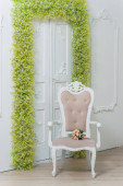 Wiosna wystrój. Białe ściany. Piękna sztukateria na ścianach. Łuk zielonych i białych kwiatów. Strefa fotografii. Wystrój drzwi z kwiatami. Oddech białego dziecka.