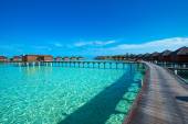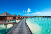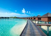 tropikalna plaża na Malediwach z kilkoma palmami i błękitną laguną