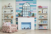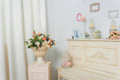 Zdjęcie "Wnętrze pokoju. Tekstura białej ściany z cegły. Ramki wiszące na ścianie. Bukiet ślubny. Białe świeczniki. Owalne lustro na stojaku. Ozdobne różowe kwiaty. Białe pianino." może być wykorzystywane do celów osobistych i komercyjnych zgodnie z warunkami zakupionej licencji Royalty-free. Obraz jest dostępny do pobrania w jakości wysokiej rozdzielczości do 5760x3840.