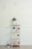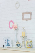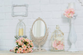 Wnętrze pokoju. Tekstura białej ściany z cegły. Ramki wiszące na ścianie. Bukiet ślubny. Białe świeczniki. Owalne lustro na stojaku. Ozdobne różowe kwiaty. Białe pianino.