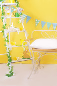 Zdjęcie "Wnętrze pokoju. Tekstura białej ściany z cegły. Ramki wiszące na ścianie. Białe świeczniki. Ozdobne różowe kwiaty. Białe pianino. Żółty budzik." może być wykorzystywane do celów osobistych i komercyjnych zgodnie z warunkami zakupionej licencji Royalty-free. Obraz jest dostępny do pobrania w jakości wysokiej rozdzielczości do 5760x3840.