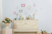 Wnętrze pokoju. Tekstura białej ściany z cegły. Ramki wiszące na ścianie. Białe świeczniki. Ozdobne różowe kwiaty. Białe pianino. Żółty budzik.