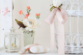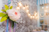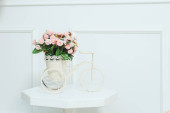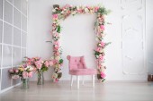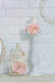 Wnętrze pokoju. Tekstura białej ściany z cegły. Ramki wiszące na ścianie. Bukiet ślubny. Białe świeczniki. Owalne lustro na stojaku. Ozdobne różowe kwiaty. Białe pianino.