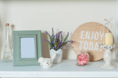 Zdjęcie "Wnętrze pokoju. Tekstura białej ściany z cegły. Ramki wiszące na ścianie. Bukiet ślubny. Białe świeczniki. Owalne lustro na stojaku. Ozdobne różowe kwiaty. Białe pianino." może być wykorzystywane do celów osobistych i komercyjnych zgodnie z warunkami zakupionej licencji Royalty-free. Obraz jest dostępny do pobrania w jakości wysokiej rozdzielczości do 5760x3840.