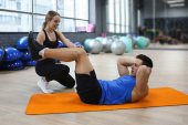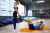 Młoda kobieta trening z trenerem w nowoczesnej siłowni