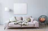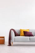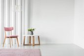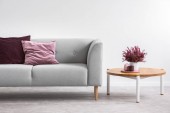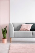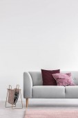 Drewniany stół na różowym dywanie z przodu szary settee z poduszkami w białym płaskim wnętrzu. Prawdziwe zdjęcie