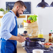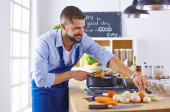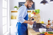 Zdjęcie "Uśmiechnięty i pewny siebie kucharz stojący w dużej kuchni" może być wykorzystywane do celów osobistych i komercyjnych zgodnie z warunkami zakupionej licencji Royalty-free. Obraz jest dostępny do pobrania w jakości wysokiej rozdzielczości do 5760x3840.