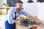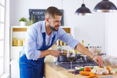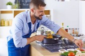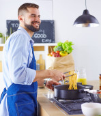 Uśmiechnięty i pewny siebie kucharz stojący w dużej kuchni