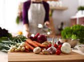 Skład z deski drewnianej i składników do gotowania na stole