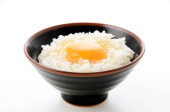 Zbliżenie na japoński ryż z jajkiem surowym, Tamago kake gohan