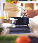 Człowiek po przepis na cyfrową tabletkę i gotowanie smaczne i zdrowe jedzenie w kuchni w domu