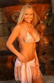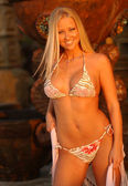 Długi prosty blondynka włosy kalendarz dziewczyna pinup styl pozować w skąpy untied bikini strzał w sesji zdjęciowej na tropikalnej wyspie na Bahamach tan mocno skóra palce na sportowiec sexy ciało tułów złoto złoto oświetlenie z błękitnego nieba słoneczny dzień kopia przestrzeń tło
