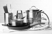 Zestaw czyste naczynia kuchenne i naczynia na stół w kuchni. Miejsca na tekst