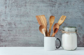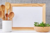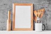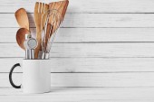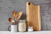 Naczynia do gotowania i deska do krojenia na białym stole