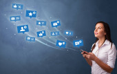 Pretty młoda dziewczyna trzyma telefon z ikonami mediów społecznościowych