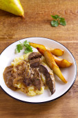 Wątroby z gruszki i krem i wina cebula sause na puree ziemniaczanym. pionowe