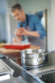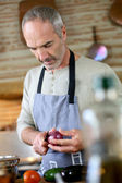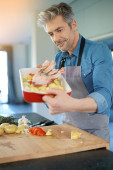 Wesoły dojrzały mężczyzna w kuchni przygotowuje danie