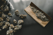 Pąki konopi w ręku na czarnym tle Tło dla miejsca Kopiuj. CBD i THC na pączkach konopi indyjskich. Młynek do ziół Świeża marihuana. Zamknij drzwi. Blunt i zapalniczki.