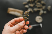 Zdjęcie "Pąki konopi w ręku na czarnym tle Tło dla miejsca Kopiuj. CBD i THC na pączkach konopi indyjskich. Młynek do ziół Świeża marihuana. Zamknij drzwi. Blunt i zapalniczki." może być wykorzystywane do celów osobistych i komercyjnych zgodnie z warunkami zakupionej licencji Royalty-free. Obraz jest dostępny do pobrania w jakości wysokiej rozdzielczości do 5760x3840.