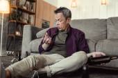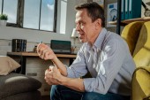 Szorstkowłose staruszek w pasiastą koszulę, obserwując nazwę pigułki