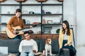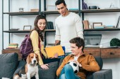 Trzech wielokulturowych studentów z książek i laptopa studiowania i jedzenia pizzy w domu