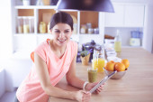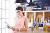 piękna młoda kobieta za pomocą tabletu cyfrowego w kuchni.