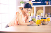 piękna młoda kobieta za pomocą tabletu cyfrowego w kuchni.