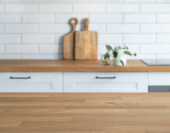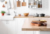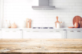 Zdjęcie "Drewniany stół w nowoczesnej kuchni" może być wykorzystywane do celów osobistych i komercyjnych zgodnie z warunkami zakupionej licencji Royalty-free. Obraz jest dostępny do pobrania w jakości wysokiej rozdzielczości do 5760x3840.