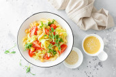 Zdjęcie "Zoodlie, zdrowej wegańskie - cukinia noodlie z świeży zielony groszek, pomidory, papryki i kukurydzy na obiad, widok z góry" może być wykorzystywane do celów osobistych i komercyjnych zgodnie z warunkami zakupionej licencji Royalty-free. Obraz jest dostępny do pobrania w jakości wysokiej rozdzielczości do 5760x3840.