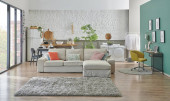 Ozdoba nowoczesnej jadalni, drewniany stół i krzesła czarne. Tło niebieskie i białe ściany. Ścienny wszystko. Szary meble, środku stół, sofa i fotel niebieski. Dywan i białe lampy wiklina.