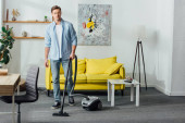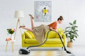 eleganckie uśmiechający się boso młoda kobieta Lewitujący w powietrzu i trzymając odkurzacz