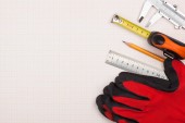 Klucz dynamometryczny, zacisk i centymetrem na górze niebieski papier milimetrowy.