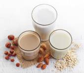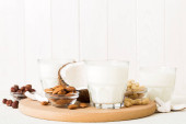 Asortyment smacznego wegańskiego mleka na białym drewnianym stole