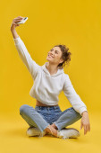 Podekscytowany emocjonalny młodych ładna kobieta pozowanie na białym tle żółte ściany Zrób selfie przez telefon komórkowy.