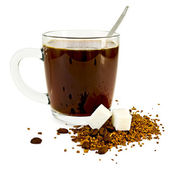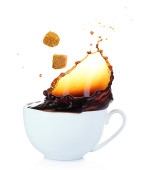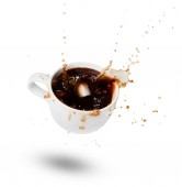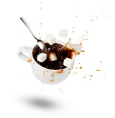 Spadające filiżankę kawy, kostki cukru i łyżkę. Wybuchy i krople. Ruchu. Cień. Biały na białym tle. Od góry.