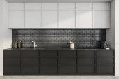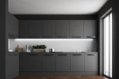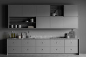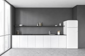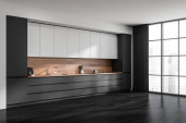 Nowoczesny design wnętrza kuchnia z oknem. 3D render.