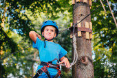 Sportowy, młody, ładny chłopiec w białe koszulki spędza czas w adventure park linowy w kasku i bezpieczny sprzęt w parku w lecie. Koncepcja aktywnego stylu życia