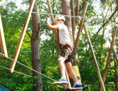 Sportowy, młody, ładny chłopiec w białe koszulki spędza czas w adventure park linowy w kasku i bezpieczny sprzęt w parku w lecie. Koncepcja aktywnego stylu życia