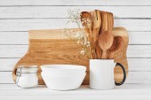 Naczynia do gotowania i deska do krojenia na białym stole