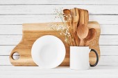 Naczynia do gotowania i deska do krojenia na białym stole